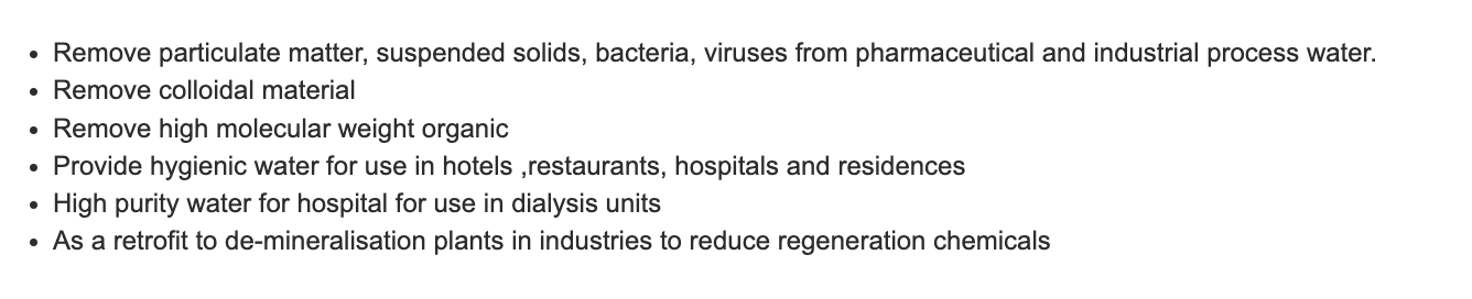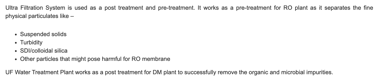 Ultra Filtration (UF) is a membrane-based separation process. Here, hydrostatic pressure is used for forcing liquid against semi-permeable membrane. This leaves behind suspended solids, colloidal particles etc. Ultra Filtration plant consists of robust hollow membranes which operate in the economical cross-flow process so as to reduce the water and energy consumption. Its compact design ensures convenient installation in existing systems control room or in a container.